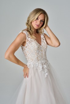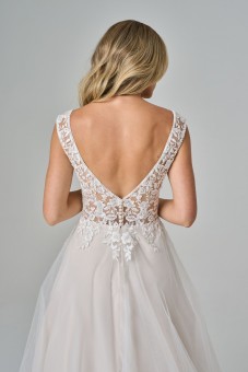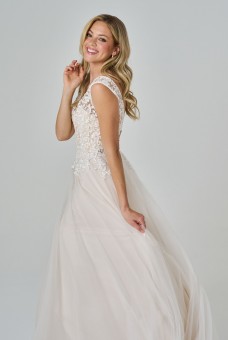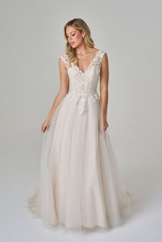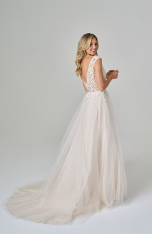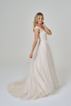 Elegáns, A-vonalú Ella Rosa menyasszonyi ruha dekoratív csipkés felsőrésszel, és puha tüllszoknyával.