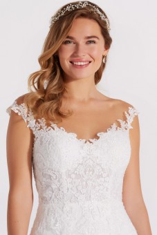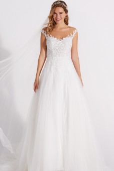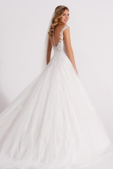 Dekoratív felsőrésszel, és puha tüllszoknyából készült menyasszonyi ruha. A felsőrészen elhelyezkedő csipkedíszítés a derék vonala alá is továbbfut. Háta mutatós, bevont gombsorral záródik.